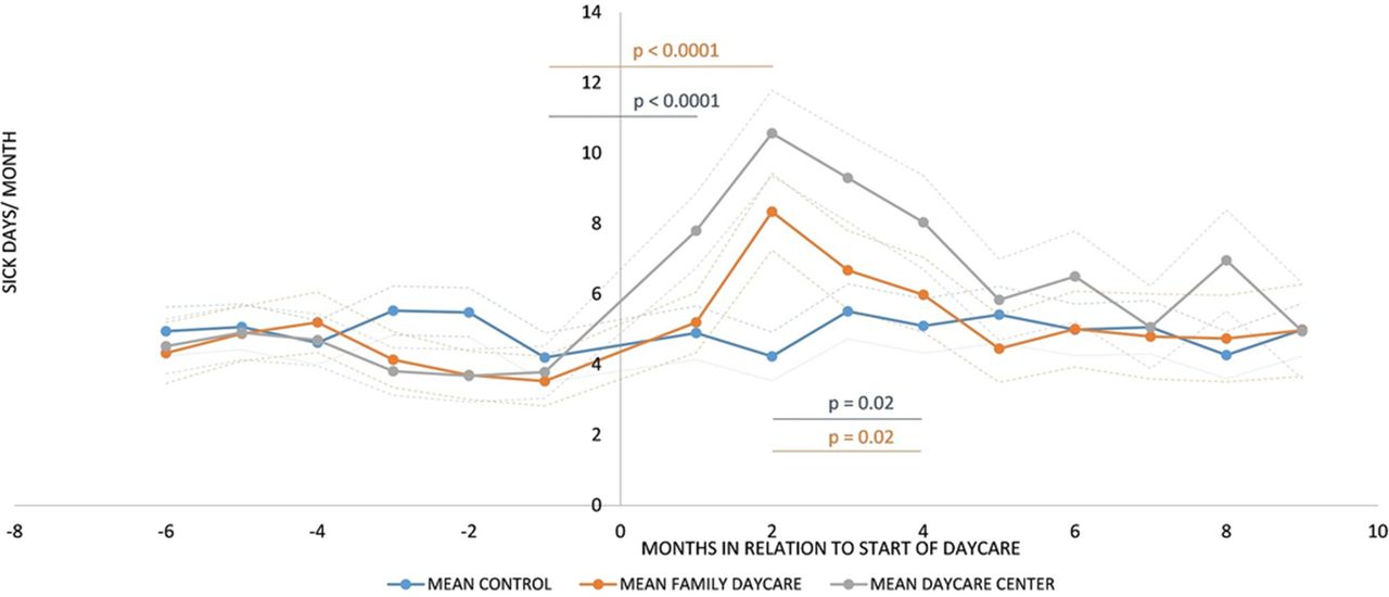 La Figure 1 muestra los días de enfermedad a lo largo del todo el período analizado. Comparados con el grupo con cuidados realizados exclusivamente en su hogar, los niños que asistieron a algún tipo de guardería (especialmente la institucional) sufrieron un aumento estadísticamente significativo en la cantidad de días de enfermedad respiratoria durante los primeros cinco meses de iniciada esta estrategia de cuidado. Pasado ese lapso, las cantidad de días de enfermedad para los tres grupos se volvió similar entre sí y, a su vez, a la del momento previo al inicio de los cuidados.