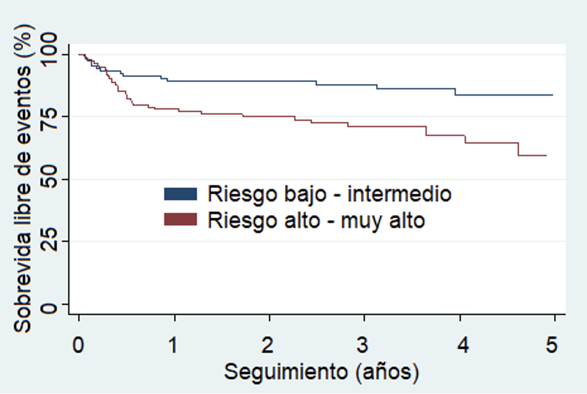 Como podemos observar en la Figure 2, la sobrevida libre de eventos a uno, tres y cinco años fue significativamente menor (Log-rank test, p= 0,001) en el grupo con puntaje de Framingham alto o muy alto (77, 71 y 59%, respectivamente) que en el grupo de puntaje bajo o intermedio (89, 87 y 83%).