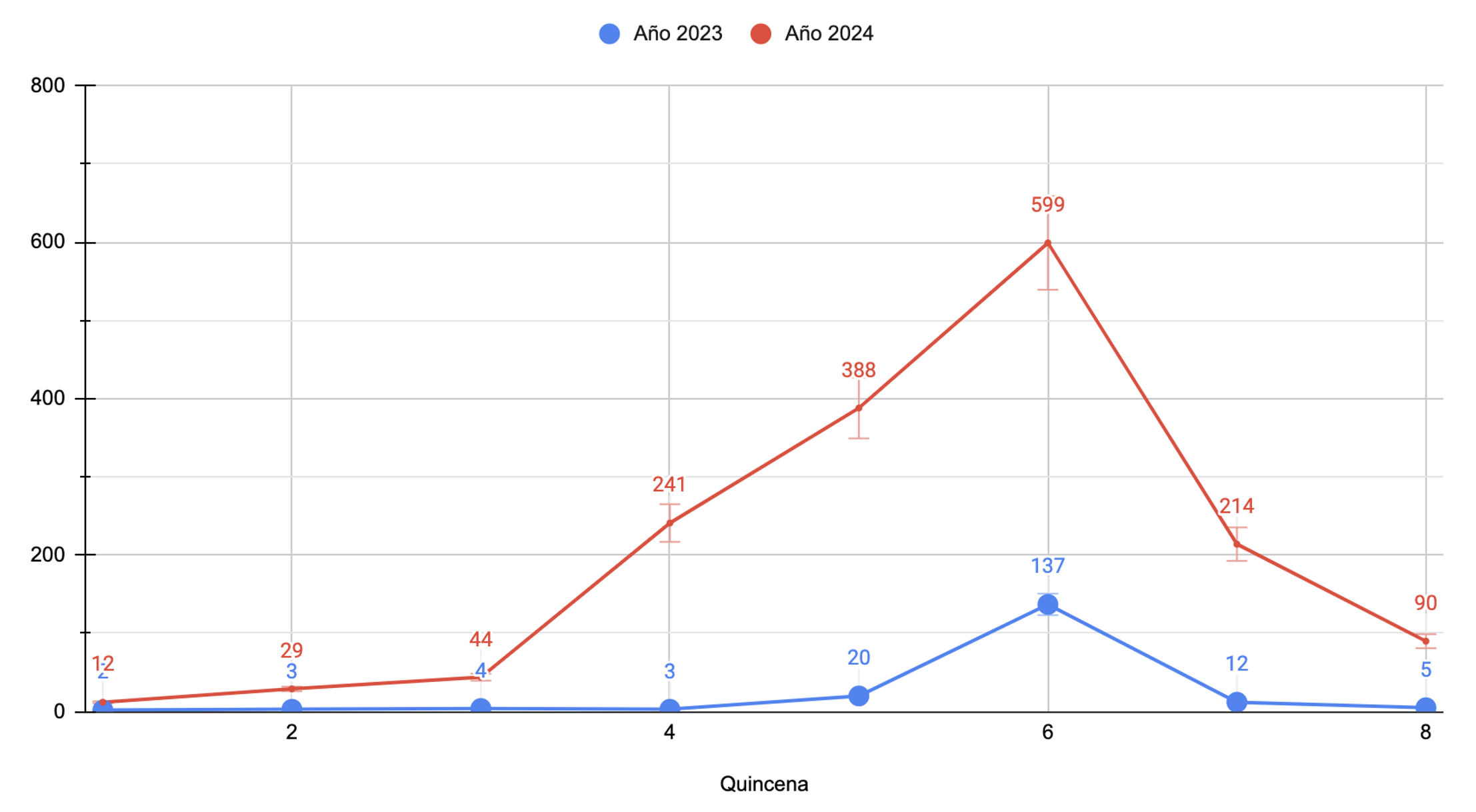 Figure 1.Recuento absoluto de casos sospechosos agrupados por quincena, comparación del mismo período en 2023 y 2024 (Quincenas: 1 y 2 = Enero; 3 y 4 = Febrero; 5 y 6 = Marzo; 7 y 8 = Abril, aproximadamente).